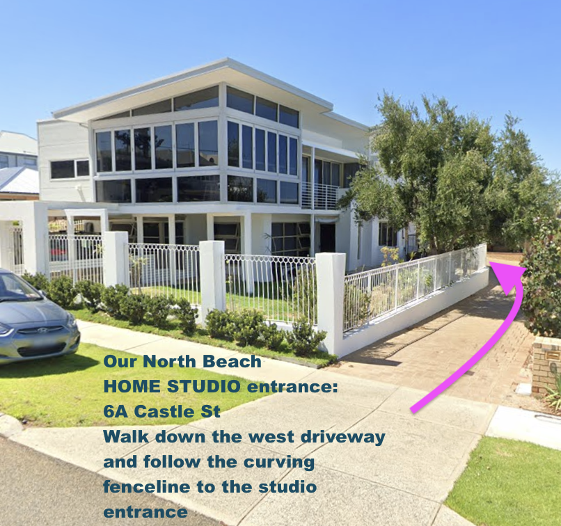 The entrance is on the West-facing side – walk down the long west-facing driveway (the big new building site will be on your right), hug the fence as it curves and you will see the veggie patch in front of the studio. Enter via the small side gate and glass doors that face west.
